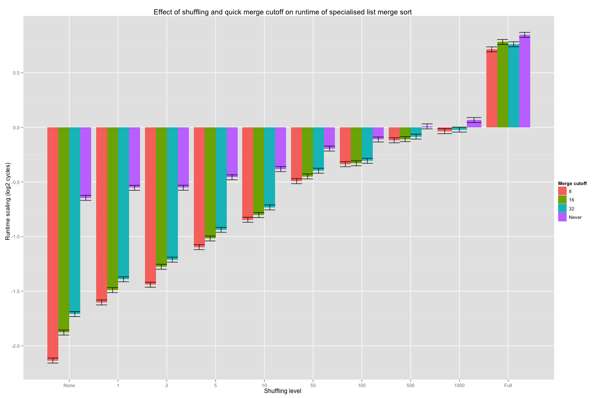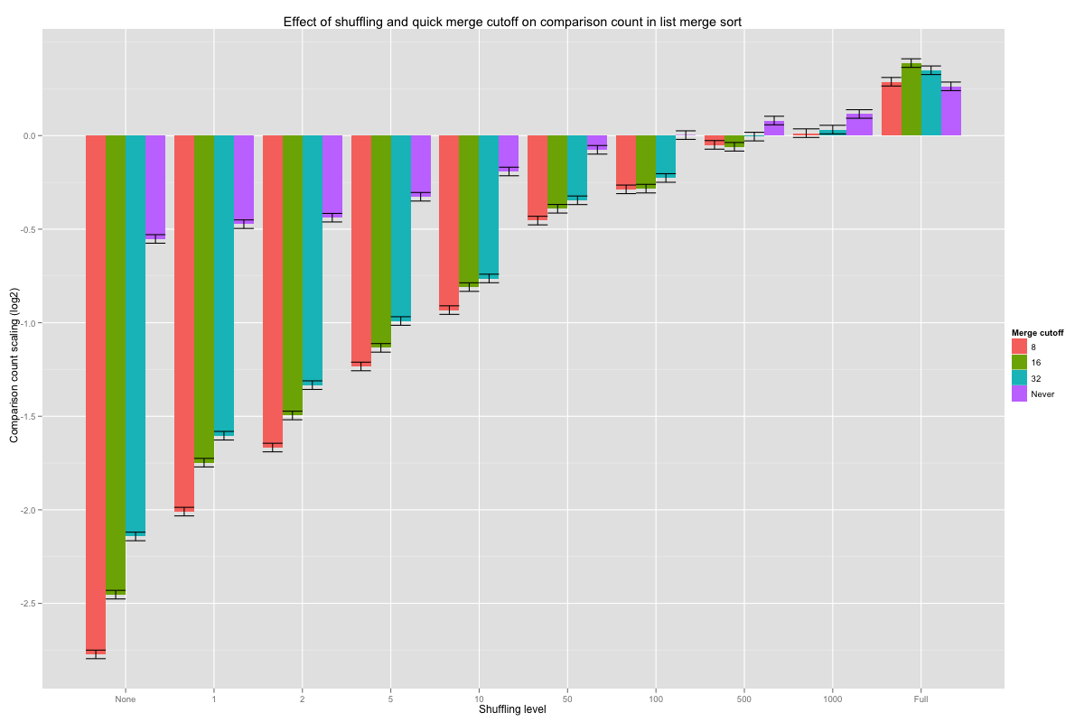 The Shuffle.Quick values are the coefficients for the crossed effect of the level of shuffling and the minimum length (cutoff) at which constant-time merge may be executed; their values are reported in the next histogram, with error bars corresponding to one standard deviation. Hopefully, a shorter cutoff lowers the number of comparisons when lists are nearly pre-sorted, and doesn’t increase it too much when lists are fully shuffled. On very nearly sorted lists, looking for pre-sorted inputs as soon as eight or more values are merged divides the number of comparisons by a factor of 4 (these are base-2 logarithms), and the advantage smoothly tails off as lists are shuffled better. Overall, cutting off at eight seems to never do substantially worse than the other choices, and is even roughly equivalent to vanilla merges on fully shuffled inputs.