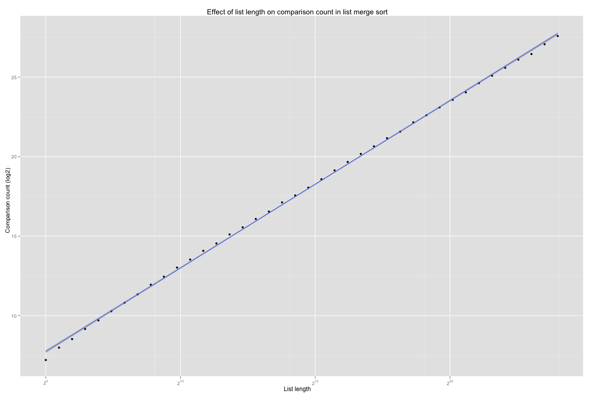 The Size.Scatter coefficients are plotted below. The number of comparison grows with the length of the lists. The logarithmic factor shows in the curve’s slight convexity (compare to the linear interpolation in blue).