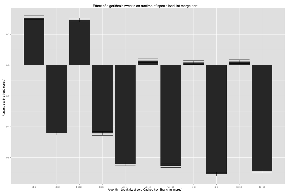 Finally, the three algorithmic tweaks. Interestingly, the coefficients tell us that, overall, the additional overhead of the branch-free merge loop slows it down by 5%. The fastest combination seems to be larger base cases, with or without conditional moves (C or T), cached calls to key (T), and branchful merge loop (T); the differences are statistically significant against nearly all other combinations, except FxTxT (no leaf sort, cached key, and branchful merge loop). Compared with the current code (FxFxT), the speed up is on the order of 5%, and at least 2% with 99.99% confidence.