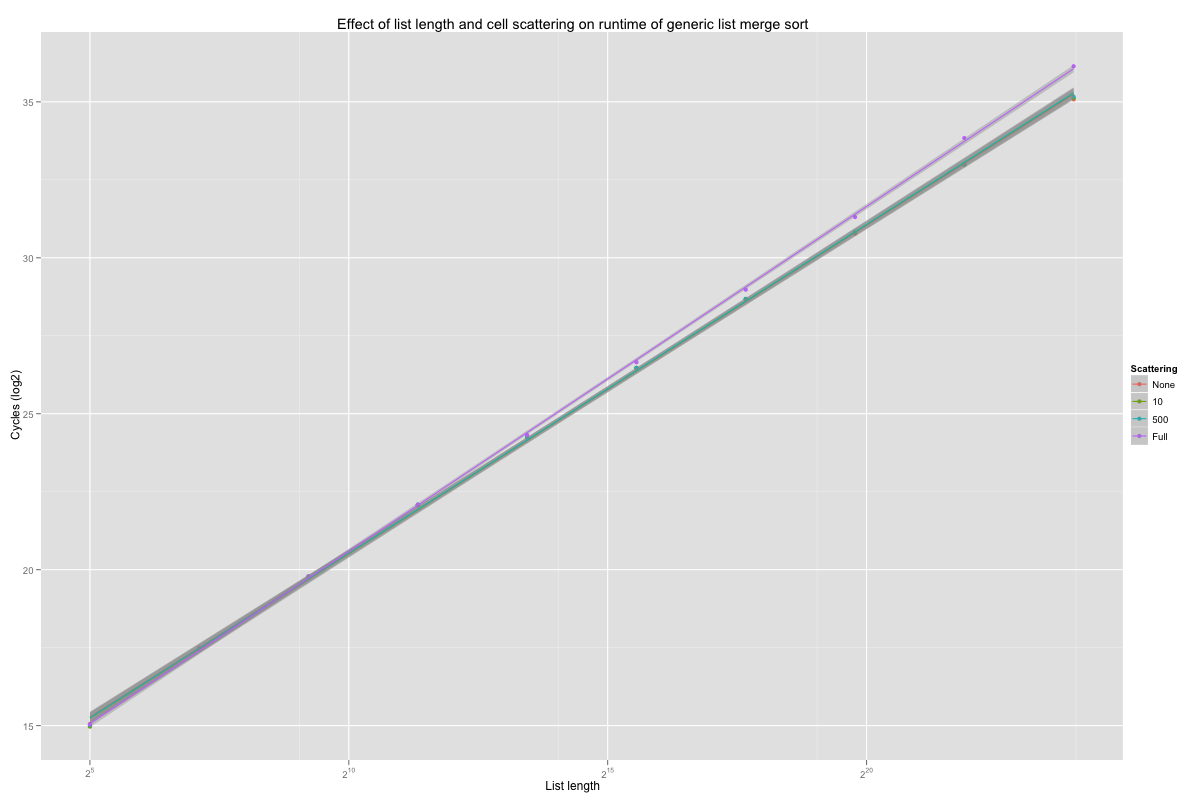 Finally, linked lists are different than vectors in one key manner: contiguous elements can be arbitrarily scattered around memory. SBCL’s allocation scheme ensures that consecutively-allocated objects will tend to be located next to each other in memory, and the copying garbage collector is hacked to copy the spine of cons lists in order. However, a list can still temporarily exhibit bad locality, for example after an in-place sort. Again, I decided to go for ordered conses, fully scattered conses (only the conses were shuffled, not the list’s values), and to interpolate, this time by swapping randomly-selected pairs of consecutive subranges a couple times.