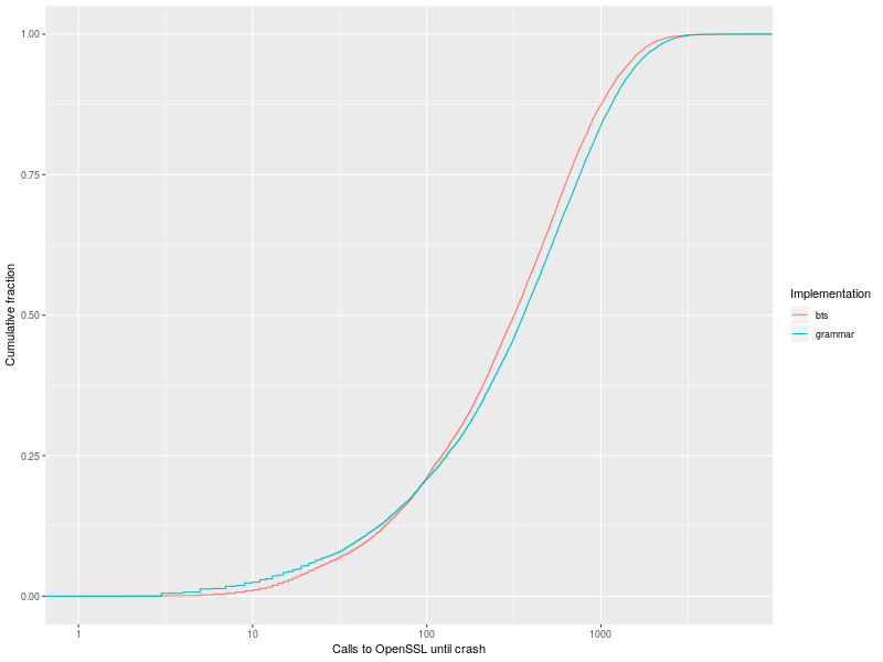 Here’s a graph of the empirical distribution functions for the number of calls into OpenSSL 1.0.1f it takes for Hypothesis to find Heartbleed, given a description of the format for Heartbeat requests (“grammar”), and the same with additional branch coverage feedback (“bts”, for Intel Branch Trace Store).