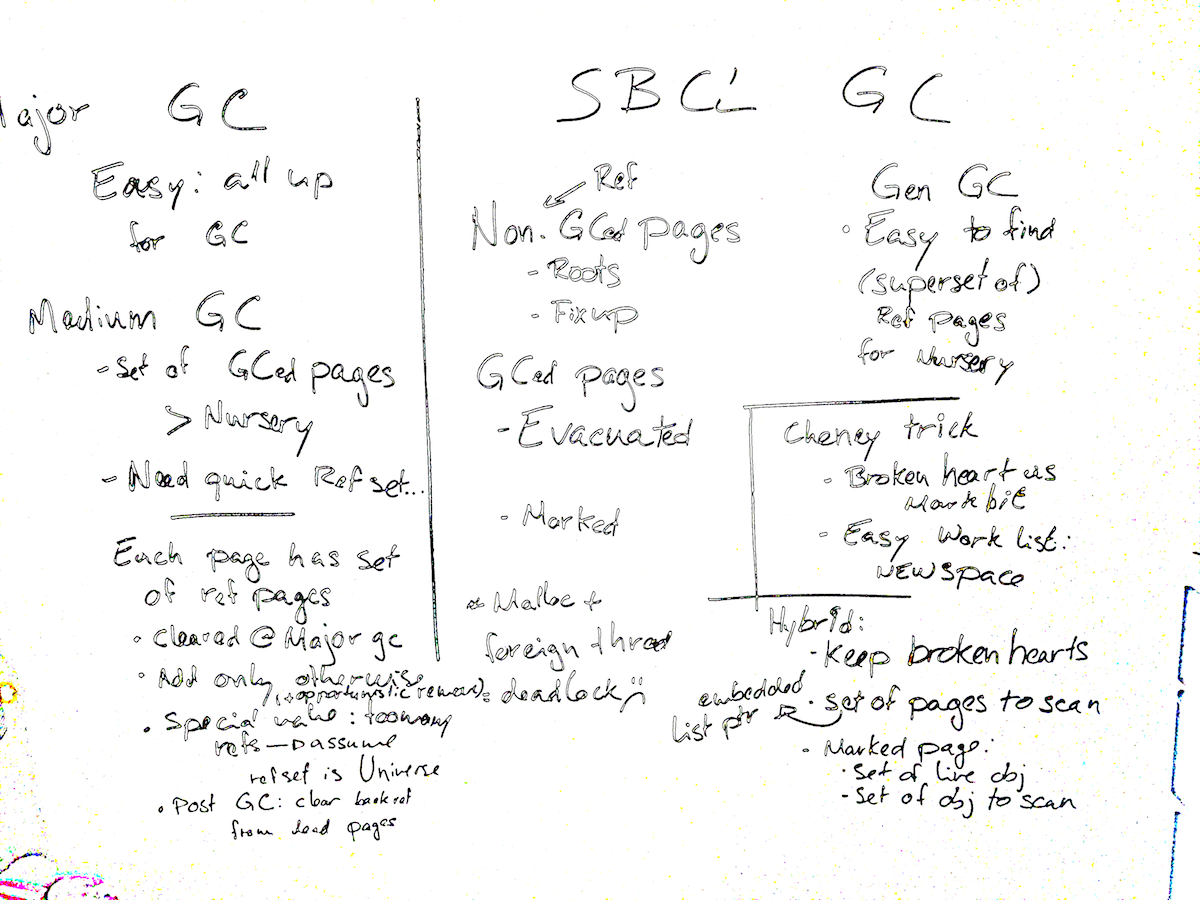 Garbage collection is in the air. My friend Maxime is having issues with D’s garbage collector, and Martin Cracauer has a large patch to improve SBCL’s handling of conservative references. I started reviewing that patch today, and, after some discussion with Alastair Bridgewater, I feel like adding a mark-and-sweep component to SBCL’s GC might be easier than what the patch does, while achieving its goal of reducing the impact of conservative references. That lead to the whiteboarding episode below and a plan to replace the garbage collecting half of SBCL’s generational GC. But first, a summary of the current implementation.