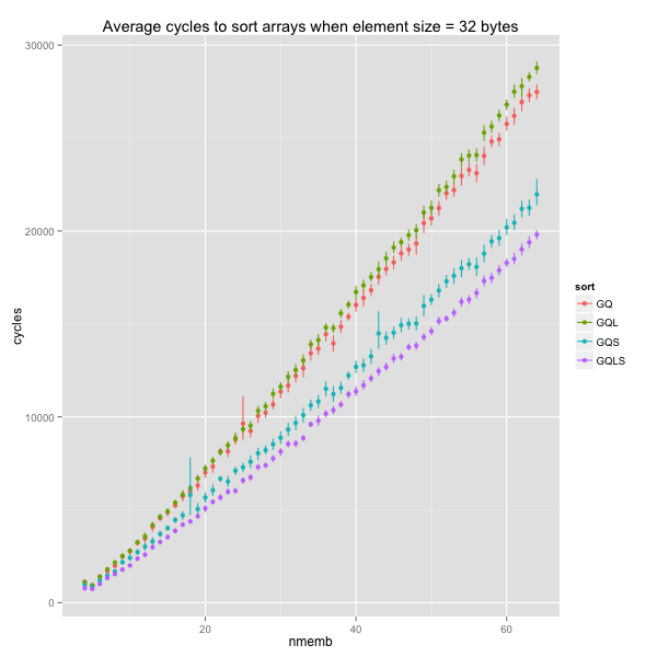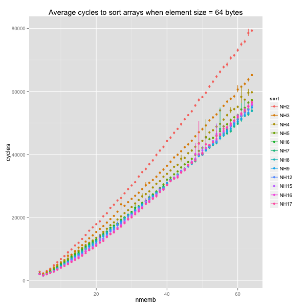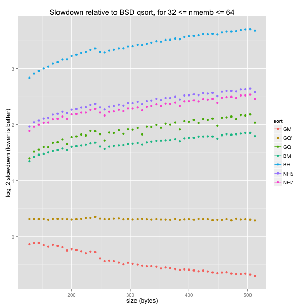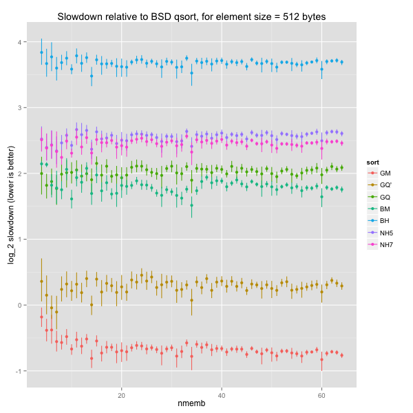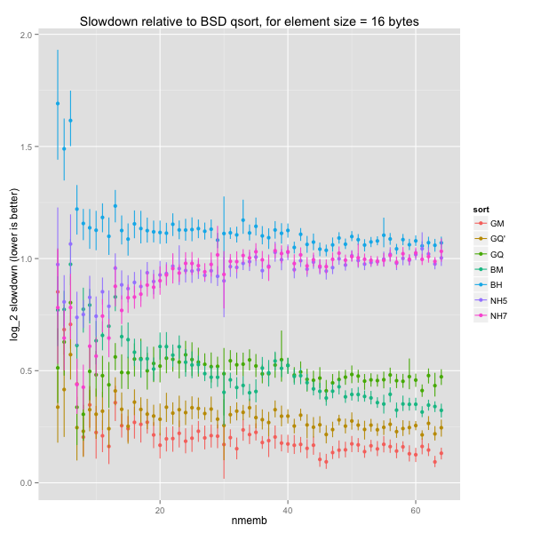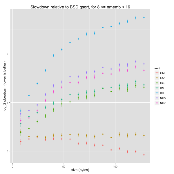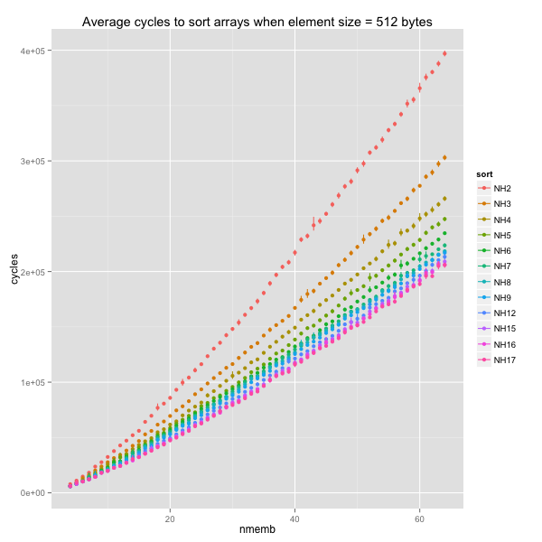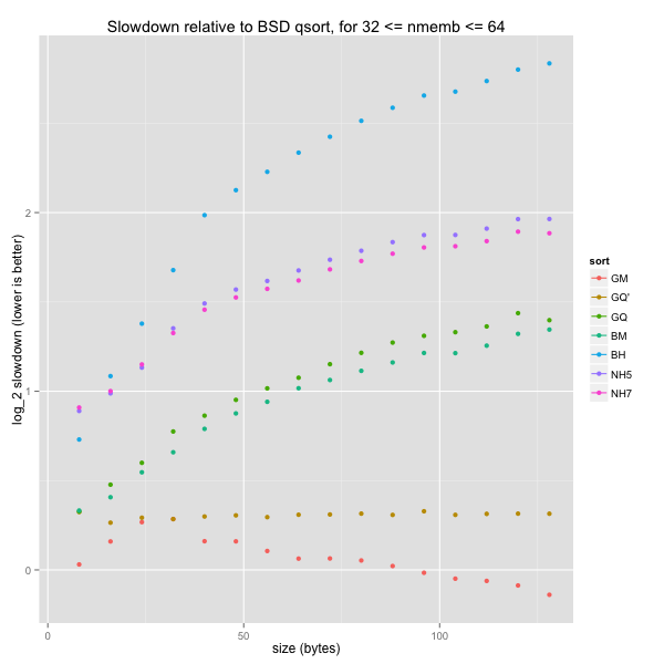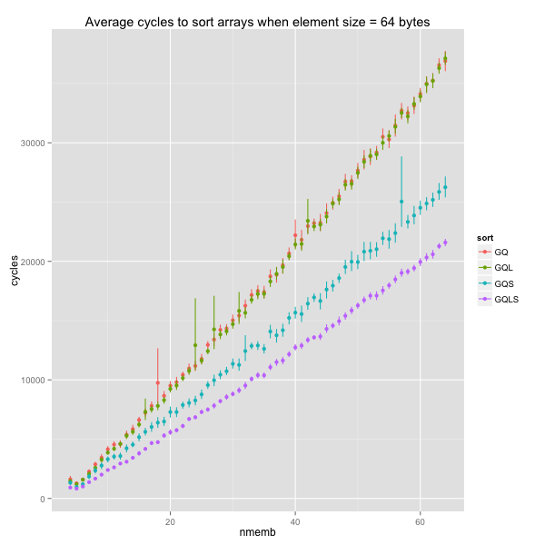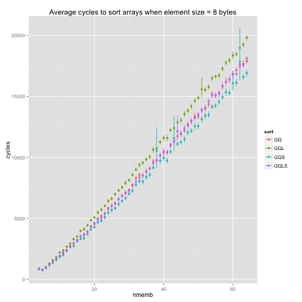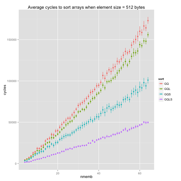 We can already see that BSD’s quicksort is hard to beat on the element sizes considered above.