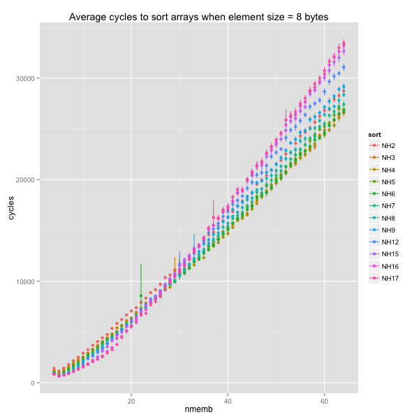 The results in the previous section were noisy: that’s expected when sorting arrays of 4 to 7 elements. This section looks at arrays of 8 to 15 elements; there’s less random variations and the graphs are much clearer.