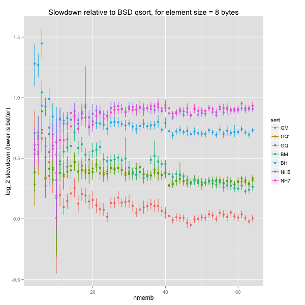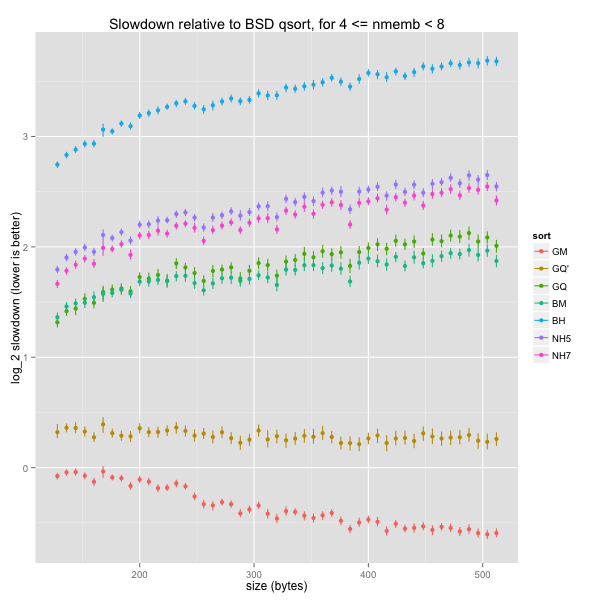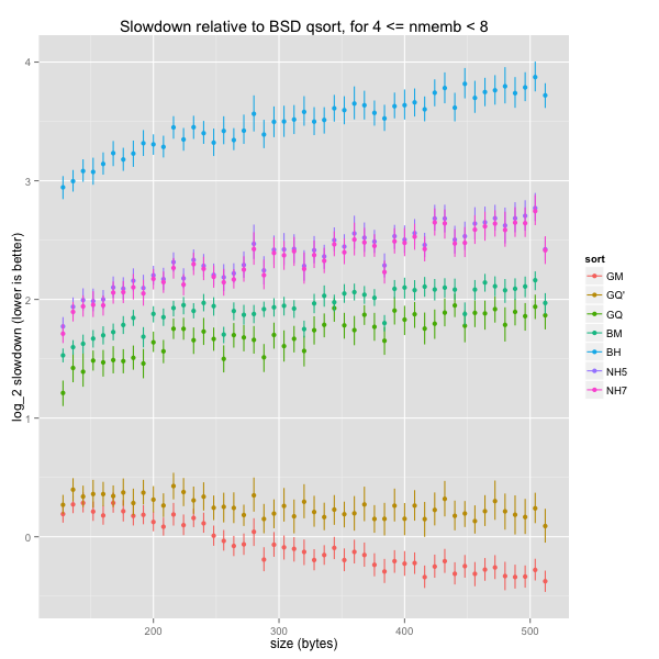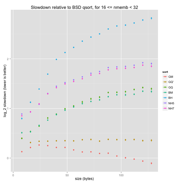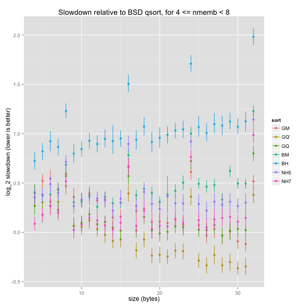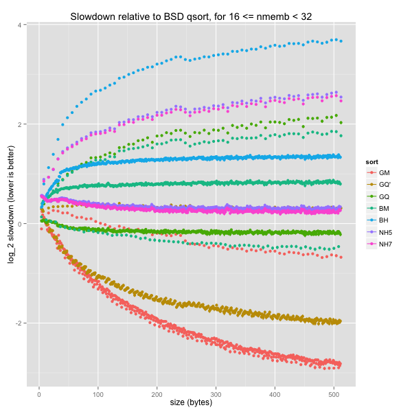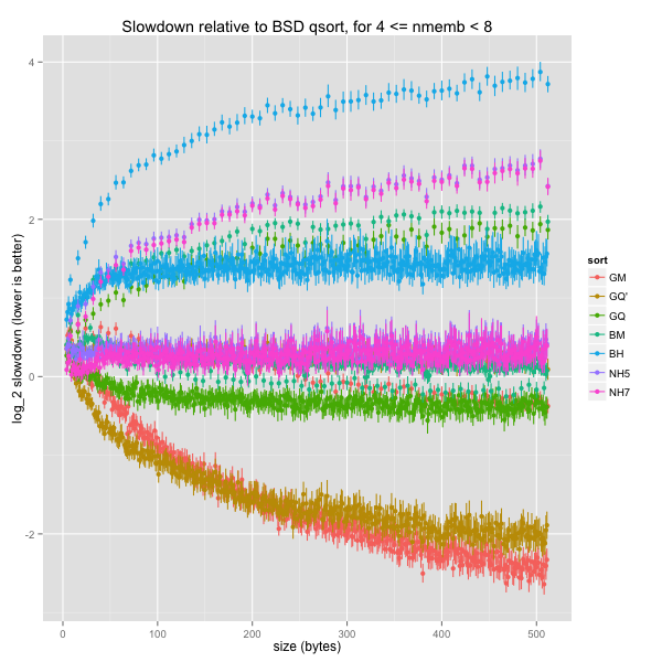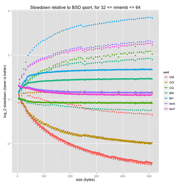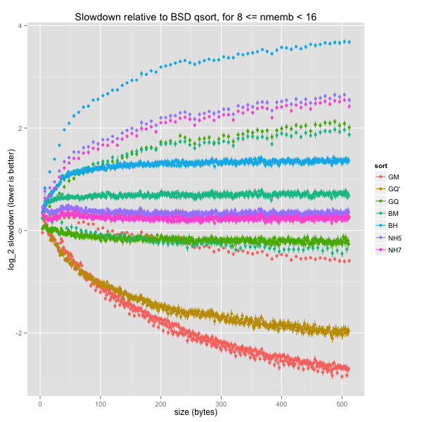 There’s some overplotting, but it’s clear that there are actually two sets of curves: the main one, and another that only comprises sizes that are multiples of 8 (word-aligned). I believe this is caused by special optimisations for nice element sizes in some (but not all) sort routines, including our baseline, BSD’s quicksort.