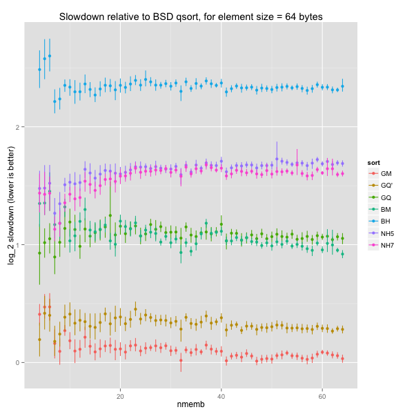 The idea is to track, within each count bin, relative speedup/slowdown compared to BSD’s quicksort: any difference in multiplicative factors, as a function of element size, should show itself. The element count bins can instead highlight differences in additive factors.