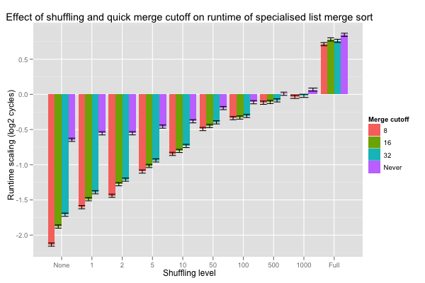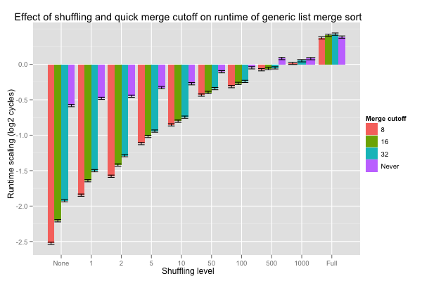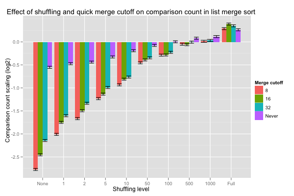 The Shuffle.Quick values are the coefficients for the crossed effect of the level of shuffling and the minimum length (cutoff) at which constant-time merge may be executed; their values are reported in the next histogram, with error bars corresponding to one standard deviation. Hopefully, a shorter cutoff lowers the number of comparisons when lists are nearly pre-sorted, and doesn’t increase it too much when lists are fully shuffled. On very nearly sorted lists, looking for pre-sorted inputs as soon as eight or more values are merged divides the number of comparisons by a factor of 4 (these are base-2 logarithms), and the advantage smoothly tails off as lists are shuffled better. Overall, cutting off at eight seems to never do substantially worse than the other choices, and is even roughly equivalent to vanilla merges on fully shuffled inputs.