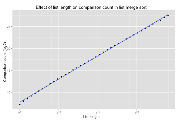 The Size.Scatter coefficients are plotted below. The number of comparison grows with the length of the lists. The logarithmic factor shows in the curve’s slight convexity (compare to the linear interpolation in blue).