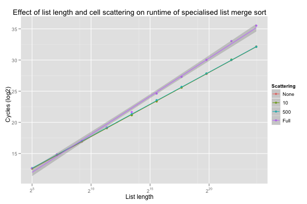 Back in November 2011, Takeru Ohta submitted a very nice patch to replace our (SBCL’s) in-place stable merge sort on linked lists with a simpler, much more efficient implementation. It took me until last May to whip myself into running a bunch of tests to estimate the performance improvements and make sure there weren’t any serious regression, and finally commit the patch. This post summarises what happened as I tried to find further improvements. The result is an implementation that’s linear-time on nearly sorted or reverse-sorted lists, around 4 times as fast on slightly shuffled lists, and up to 30% faster on completely shuffled lists, thanks to design choices guided by statistically significant effects on performance (… on one computer, my dual 2.8 GHz X5660).