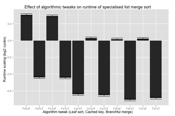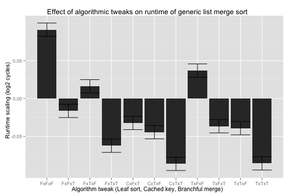 Finally, the three algorithmic tweaks. Interestingly, the coefficients tell us that, overall, the additional overhead of the branch-free merge loop slows it down by 5%. The fastest combination seems to be larger base cases, with or without conditional moves (C or T), cached calls to key (T), and branchful merge loop (T); the differences are statistically significant against nearly all other combinations, except FxTxT (no leaf sort, cached key, and branchful merge loop). Compared with the current code (FxFxT), the speed up is on the order of 5%, and at least 2% with 99.99% confidence.