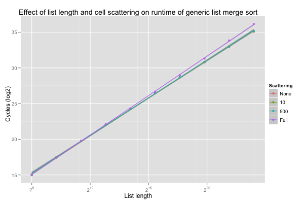 Finally, linked lists are different than vectors in one key manner: contiguous elements can be arbitrarily scattered around memory. SBCL’s allocation scheme ensures that consecutively-allocated objects will tend to be located next to each other in memory, and the copying garbage collector is hacked to copy the spine of cons lists in order. However, a list can still temporarily exhibit bad locality, for example after an in-place sort. Again, I decided to go for ordered conses, fully scattered conses (only the conses were shuffled, not the list’s values), and to interpolate, this time by swapping randomly-selected pairs of consecutive subranges a couple times.