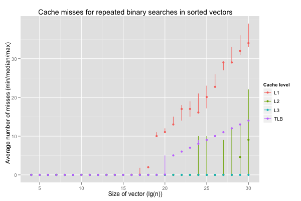 The number of L1 cache misses explodes on vectors of 512K elements and more. The L1D is designed so that only contiguous ranges of \(64\times 512\div 8 = 4 \textrm{KB}\) (one normal page) can be cached without collisions. For \(\lg(n)=19\), binary search needs 10 reads that all map to the same set of cache lines before reducing the candidate range below 4 KB. Once the first level cache’s 8-way associativity has been exhausted, binary search on a vector of 512K 4-byte elements still has to read two more locations before hitting a different set (bucket) of cache lines. This accounts for the L1 misses: so many reads are to locations that map to the same cache lines that a tiny working set exceeds the L1D’s wayness. To make things worse, LRU-style replacement strategy are useless. We have a similar issue on TLB misses (plus, filling the TLB on misses means additional data cache misses to walk the page table).