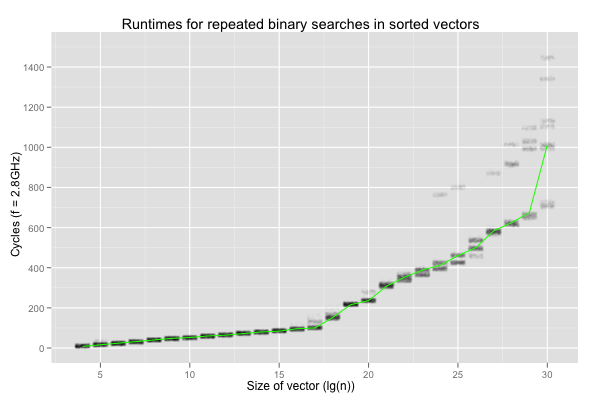 The variation is even stranger. It happens between executions of identical binaries for a deterministic program, on the same machine and OS, but never in a single execution. The variation makes no sense. If the definition of insanity is doing the same thing over and over again and expecting different results, contemporary computers are quite ill. Worse, the variation would never have been uncovered by repetitions in a single process. I was lucky to look at the results from multiple executions, otherwise I could easily have concluded that binary search for the same element in a vector of 1G 32-bit elements almost always takes around 700 cycles, or almost always 1400ish cycles.