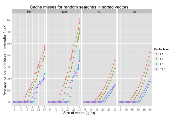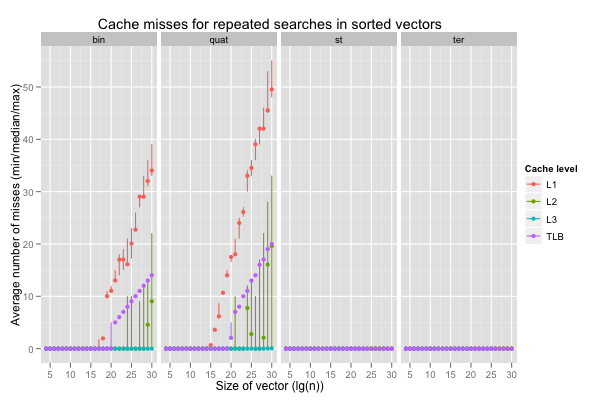 The next graph reports the number of cache misses at the first, second, third and translation lookaside buffer levels. The average count per search over 100 000 repetitions were recorded in 10 independent executions for each size. The points correspond to medians of ten average counts, and the vertical lines span the minimum and maximum counts.