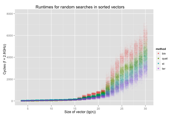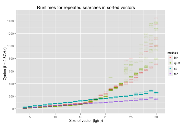 For the rest of the post, I’ll only consider google’s dense hash table, g++’s red-black tree, the offset quaternary search and the ternary search. Note that both the offset quaternary and ternary searches exhibit consistently better performance than the offset binary search, for which aliasing isn’t an issue. These alternative ways to search sorted vectors can thus be expected to improve on binary search even on vectors of lengths that are far from powers of two.