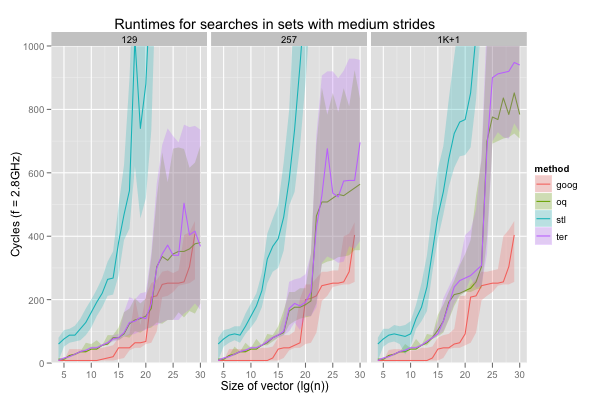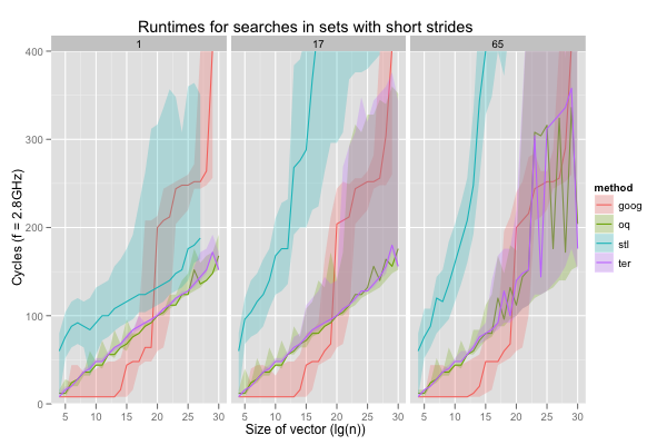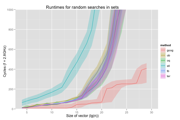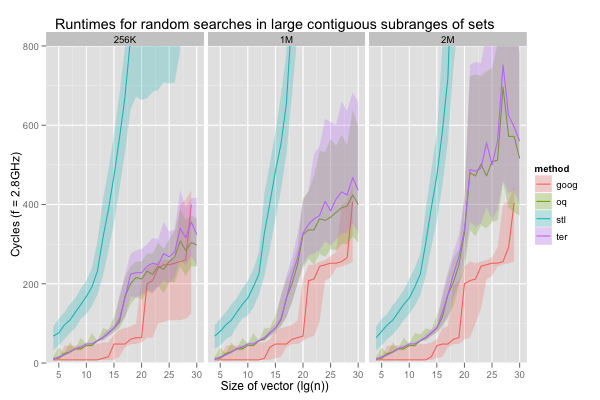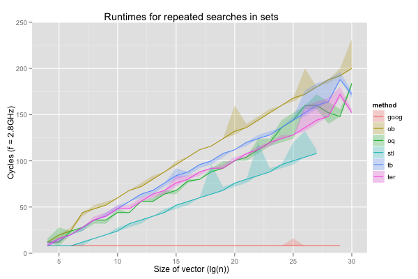 I also compared the performance of g++’s (4.7) STL set, and google’s dense_hash_set, which don’t search sorted vectors, but do work with sets, ordered or not.