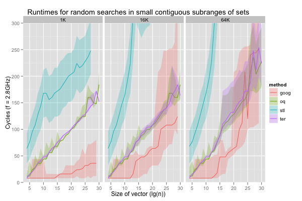 The red-black tree was slightly faster than the sorted vector searches when the key was always the same. This isn’t the case when the keys are selected from a small subrange. On all six scenarios and across all sizes, the 10th percentile for ‘stl’ is slower than the 90th for either ‘oq’ or ‘ter’. As expected, the runtimes for the hash table (‘goog’) evolve in plateaus, as the working set outstrips each level of caching. When it exceeds even the L3 (256K values in distinct cache lines is just barely larger than L3) its performance is more or less comparable to that of the sorted vector searches, as long as the subrange is below 2M items. All the sorted set implementations exhibit the same roughly sigmoidal shape for runtimes as functions of the set size. However, except for a few spikes on very large vectors, runtimes for the sorted vector searches grow much more slowly, and are more stable than for the red-black tree. In general, the offset quaternary search seems to execute a bit faster than the ternary search, but the difference is minimal. More importantly, when working with medium subranges (around 64K to 1M elements) in medium or large sets (1M elements or more), the sorted vectors searches are competitive with a hash table, in addition to being more compact.